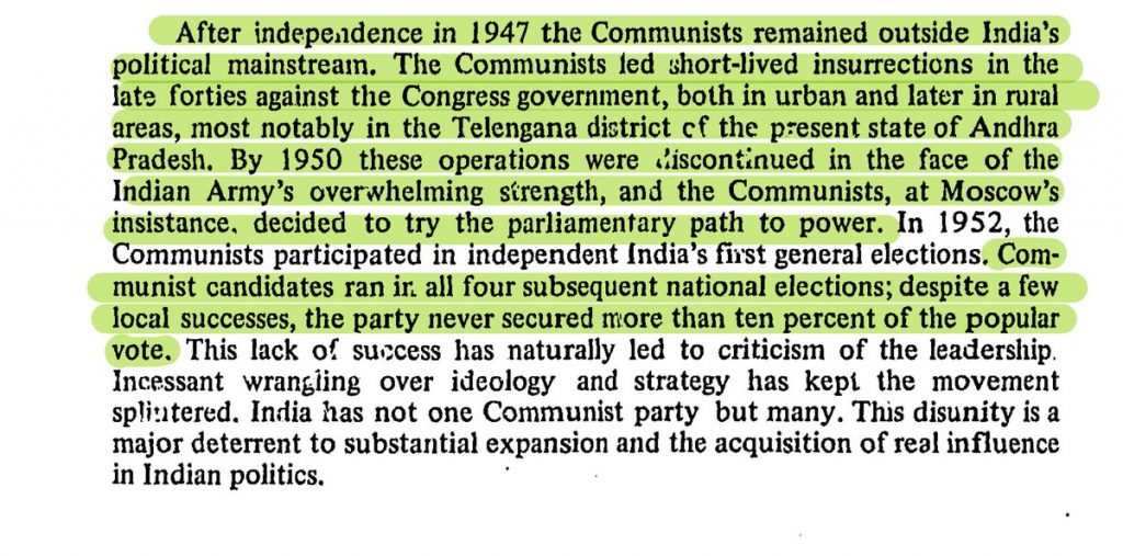 Name of CPI in Palghar lynching got me wondering. I realized many of us don’t know what we call as left & various fragments they have which are all working towards the same cause in their own way. What is left and what is Left’s legacy in destroying independent India? There are about 25+ big and small communist parties in India. Few know that Communists did not want to join the democratic process and wanted to undertake an armed revolution. As per this declassified CIA file, they joined Indian political mainstream on Soviet insistence.